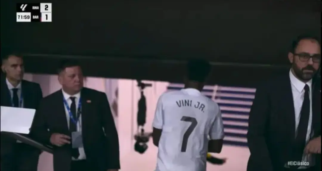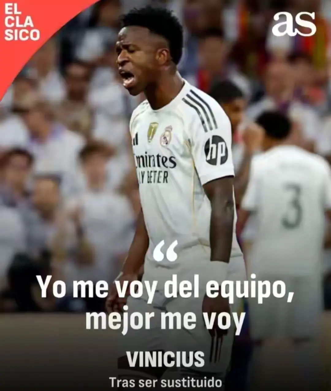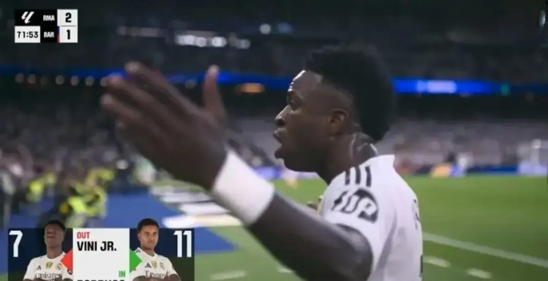 比赛第72分钟,当维尼修斯看到第四官员举起皇马11号换下7号的牌子时非常惊讶,露出一脸不解的表情,随即情绪极其激动,对着主教练哈维·阿隆索反复问道:“我?”,语气中充满难以置信,还不断称呼对方 “教练,教练”。被换下的路上,一路喋喋不休,而且没有与阿隆索击掌或者示意,径直走回更衣室。维尼修斯在离开球场时口吐芬芳,DAZN专家对他的唇语进行了解读。在确认自己确实是被换下的球员后,这位巴西球员彻底失控,愤怒地喊道:“见鬼去吧”。这句表达愤怒或沮丧的话语在巴西葡语中有多种含义,包括“滚蛋”“去你的”或“该死的”。随后,维尼修斯径直走向球员通道,一路上不停咒骂,情绪完全失控。哈维·阿隆索试图平息他的怒火,说道:“好了,维尼修斯,拜托。”而维尼修斯则在途中怒斥:“我要离开球队,最好让我走。” 几分钟后,当他回到替补席时,卢宁上前安慰了他。