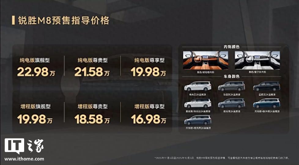 IT之家 11 月 5 日消息,北汽制造锐胜 M8 中大型 MPV 今日开启预售,新车可选纯电 / 增程动力、7 / 9 座布局,搭载 L2 级地平线智驾辅助,预售价为 16.98 万元-22.98 万元。此外,锐胜已正式从车型独立为旗下子品牌,并专注于 MPV 品类。