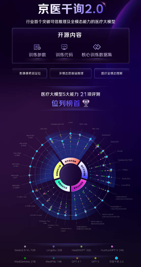 作为京东健康AI医疗体系的技术底座,“京医千询”医疗大模型迎来2.0版本的重大升级。“京医千询2.0”是行业首个突破可信推理与全模态能力的医疗大模型,其严格模拟医生临床诊疗思维路径,深度融合医学知识体系与真实诊疗逻辑,并在推理过程中主动引入并校准外部循证医学证据。通过百万级临床真实案例的学习与全模态技术加持,其临床经验与判断能力正快速逼近人类专家水平。