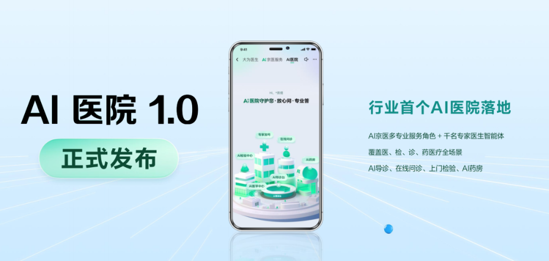 京东健康还正式发布“AI医院1.0”,在业内首创以AI驱动的“医检诊药”全链路服务闭环。AI医院汇聚了包括AI医生“大为”“小微”、AI营养师“小晶”、AI药师“小方”等十余类专业服务智能体,以及来自全国400余家三甲医院的1000余名专家医生智能体,为用户提供7*24小时不间断的在线导诊、问诊、报告解读与健康管理服务。