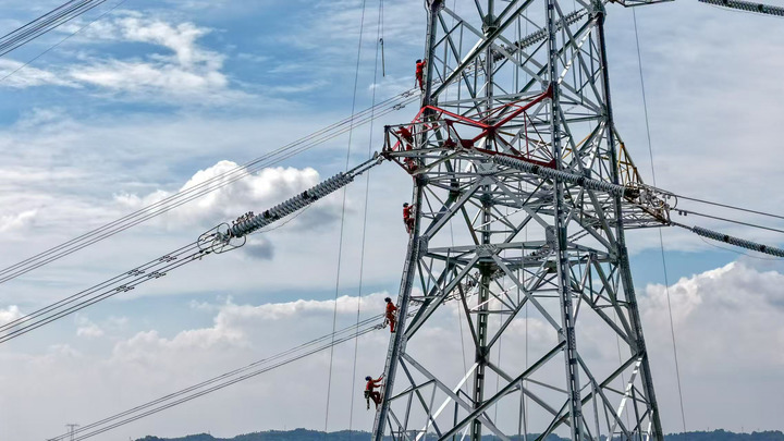 2025年10月1日,重庆送变电公司施工人员在哈密至重庆特高压直流受端500千伏配套工程(二期)作业现场工作。新华社发(周亚 摄)