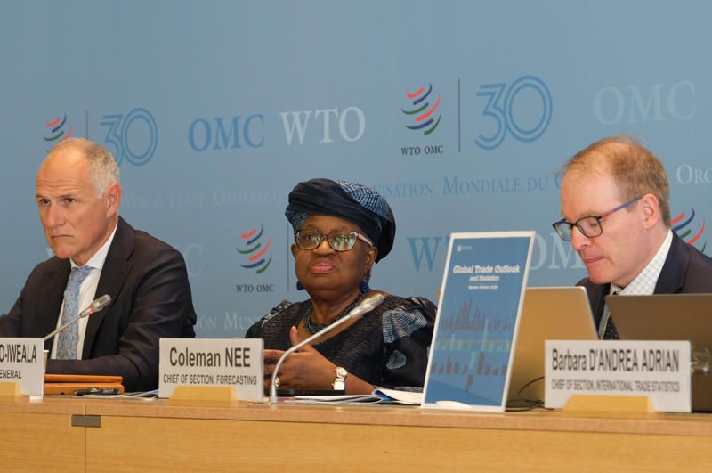 10月7日,在瑞士日内瓦世界贸易组织总部,世贸组织总干事伊维拉(中)在新闻发布会上讲话。 新华社记者 马汝轩 摄