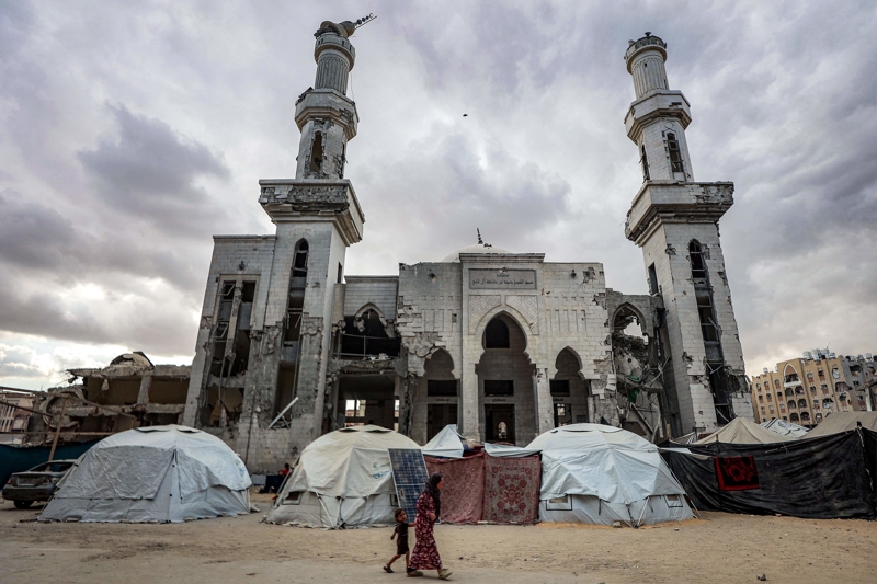 10月6日,在加沙地带南部的汗尤尼斯,一名女子带着孩子走过街头。