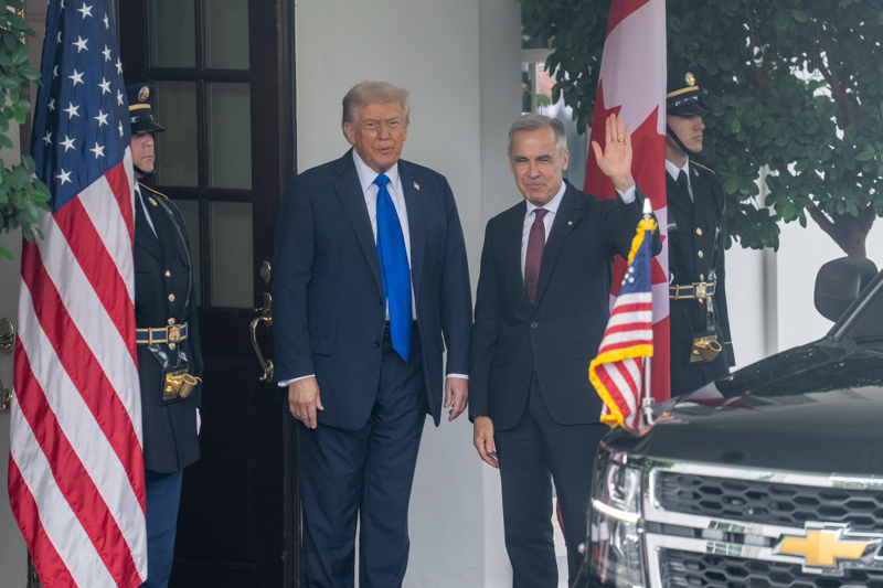 10月7日,在美国首都华盛顿白宫,美国总统特朗普(中左)迎接到访的加拿大总理卡尼。 新华社记者 胡友松 摄