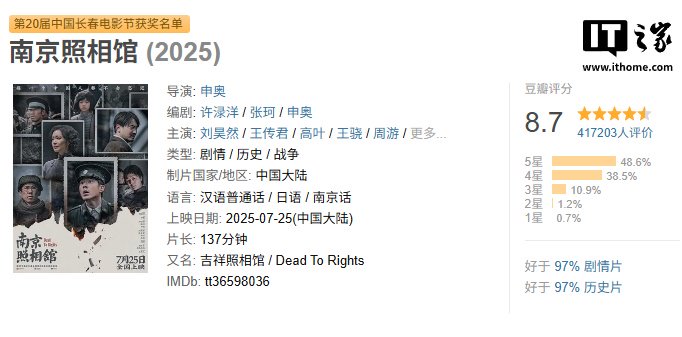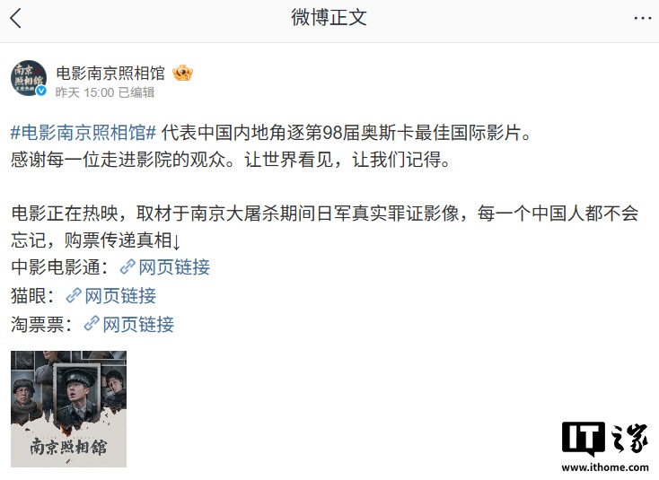 IT之家 9 月 27 日消息,电影《南京照相馆》官微 9 月 26 日发布消息,申奥导演的《南京照相馆》将代表中国内地角逐第 98 届奥斯卡最佳国际影片。